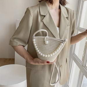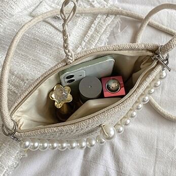 大ぶりのパールが目を引く夏らしいショルダーバッグ。ポイント使いにもおすすめです。