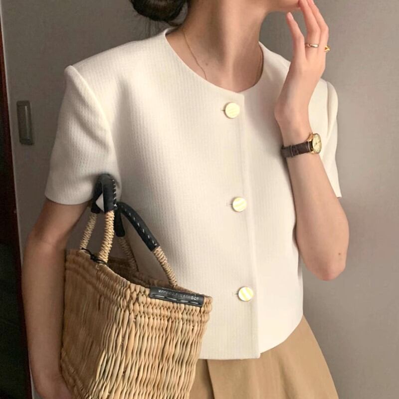 シンプルなデザインに大きぼボタンが映える。ショートパンツと合わせて